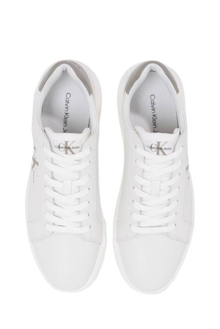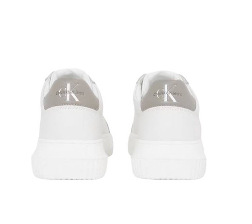 Sneakers da uomo Calvin Klein jeans colore bianco brillante con dettaglio beige sul tallone, realizzate esternamente in pelle liscia. Una scarpa dal design moderno e versatile, ideale da indossare per completare i nostri outfit quotidiani preferiti.